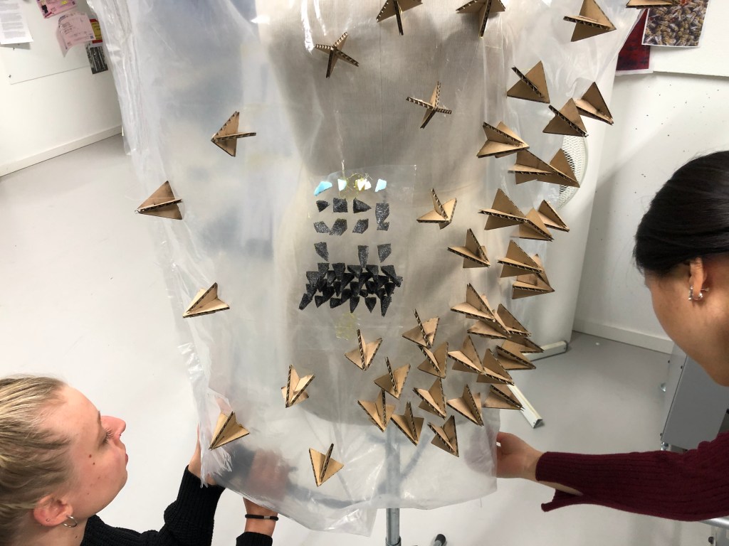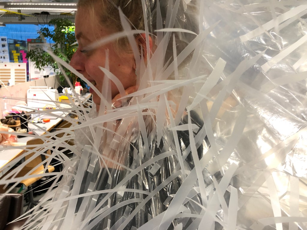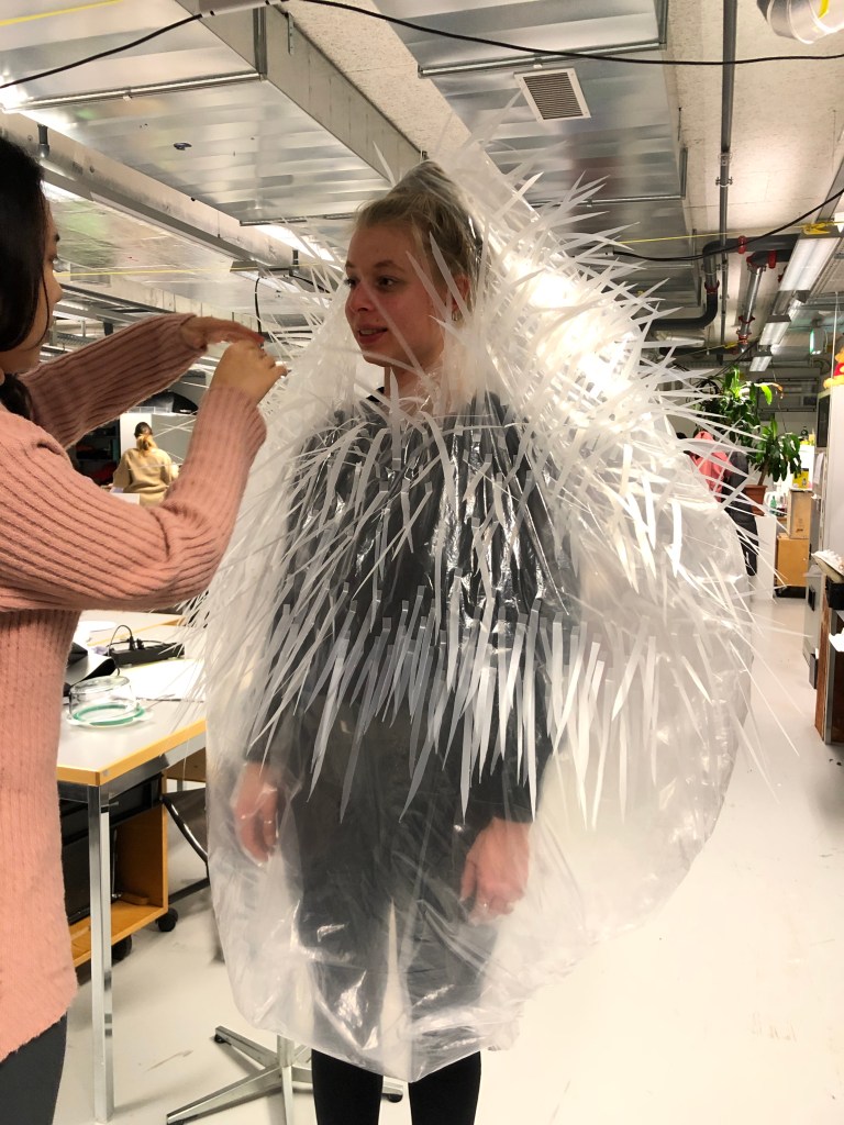 We had to make the spikes manually as we couldn’t use the laser cutter. The material was too vurnerable to be cut in the laser cutter. Therefore, we had to find out how to mass-produce the spikes. We first thought the transparent spikes would work well with the plastic foil that we choose. And we tried hard to keep the movement visible when the balloon was inflating.